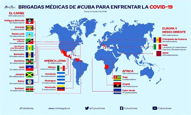 Según la Organización Panamericana de la Salud (OPS) en Cuba, la primera brigada de profesionales de la salud isleños que brindó servicios en el exterior lo hizo en Argelia, en 1963. Desde entonces, han servido en países de América Latina y el Caribe, África, Oriente Medio, Asia, y Europa.